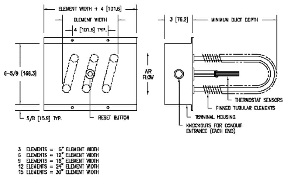 | 240 Volt 1 Ph | 480 Volt 3 Ph | Watts | Min. Duct Depth (in.) | Element Width (in.) |